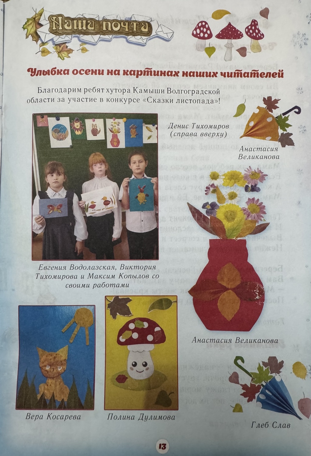 Ребята из детского творческого объединения «Радуга» приняли участие в конкурсе "Сказки листопада ". Ежегодный конкурс рисунков и поделок проводит детский журнал «Православная радуга», с которым мы тесно сотрудничаем. В своих работах дети попробовали поделиться своим осенним настроением и рассказать о своей осени, проявили свою фантазию. Некоторые работы наших ребят напечатаны в журнале.